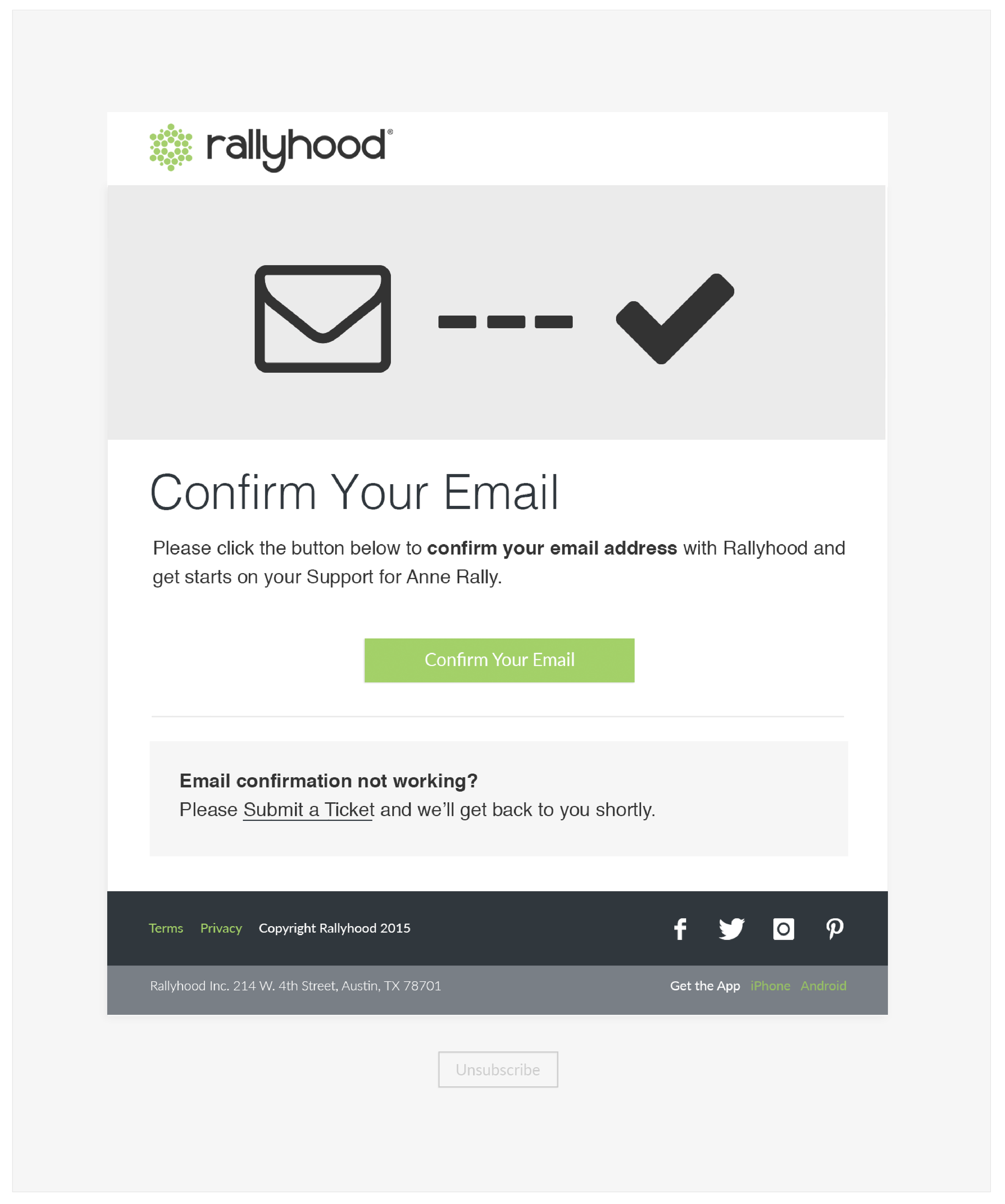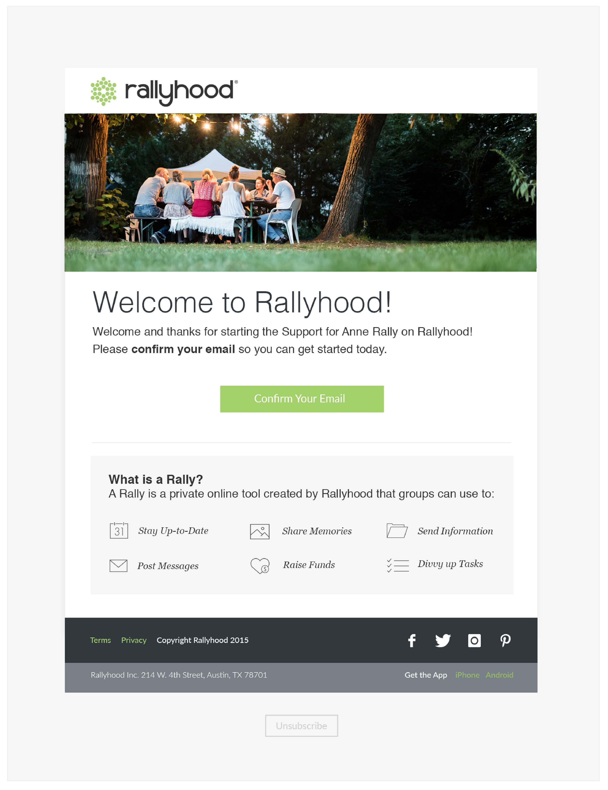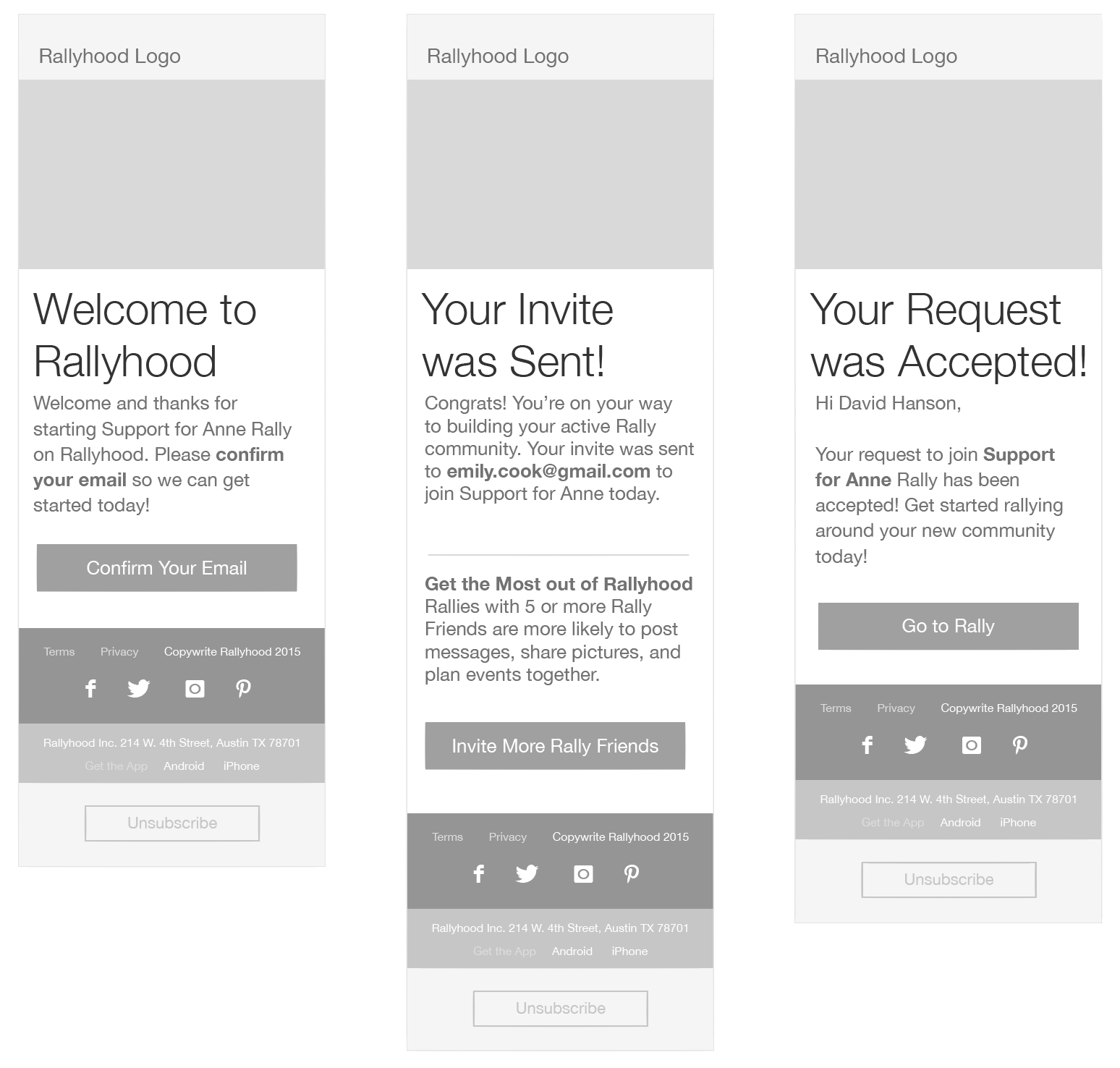Another part of overhauling the "First 30 Clicks" for a new customer to activate his/her account with Rallyhood was a redesign of the new user emails. These emails are used to confirm a user has set up an account as well as continuing to engage the users to use the product.
