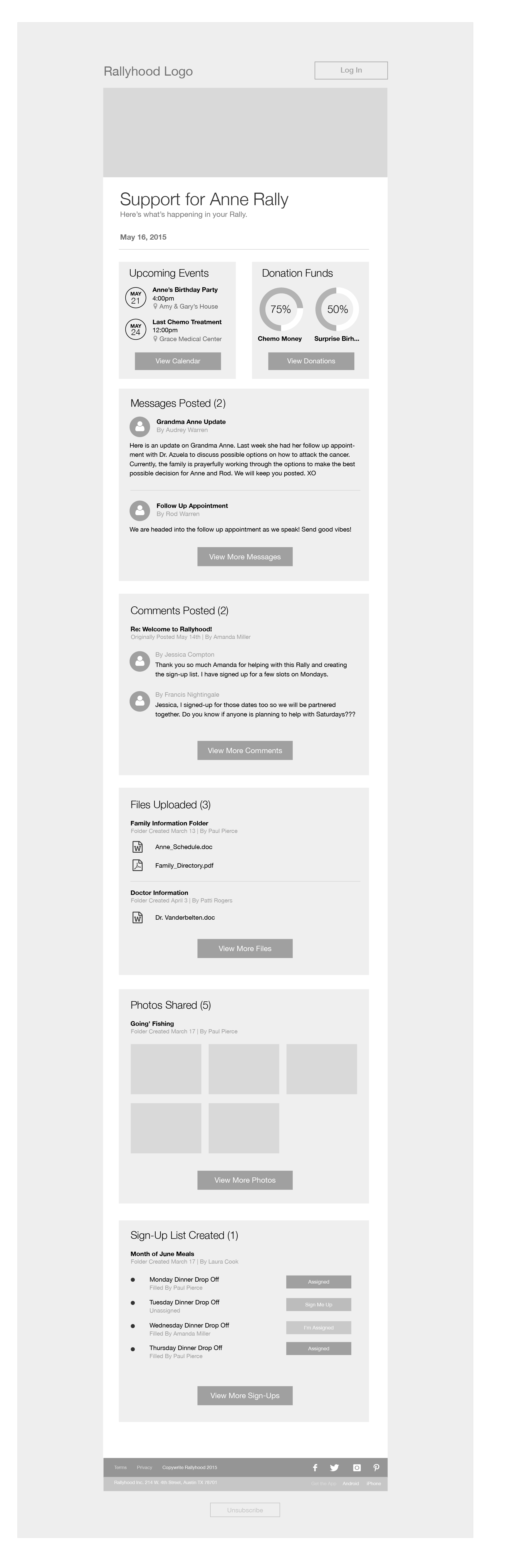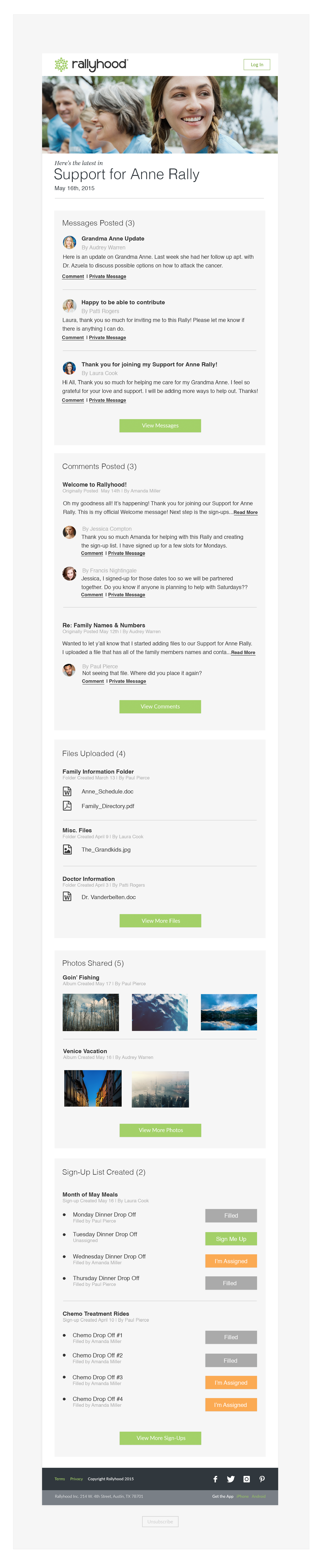 One email in particular that was redesigned was the Daily Digest. The Daily Digest is an email the user will receive daily or weekly updating him/her on all of the activity within the Rally they are apart of. The goal of this email was to keep the user informed as well as giving them many access points to which they can easily get onto the platform via browser or mobile.